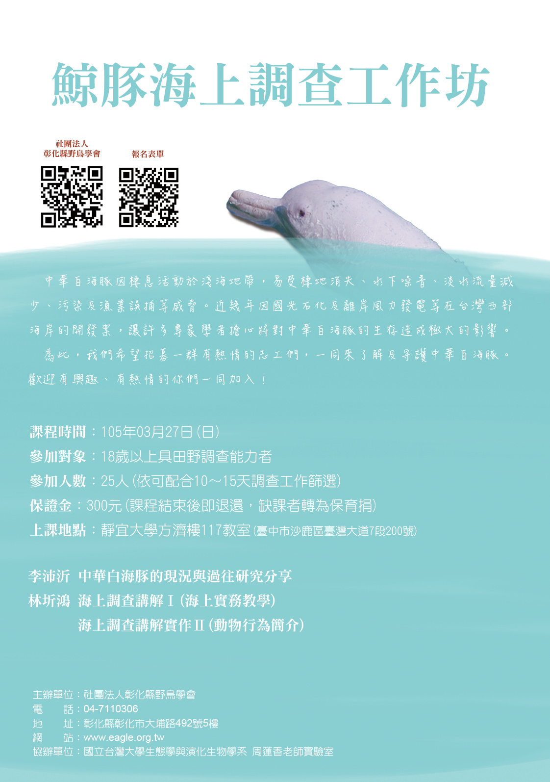 【研習培訓】鯨豚海上調查工作坊中華白海豚因棲息活動於淺海地帶,易受棲地消失、水下噪音、淡水流量減少、污染及漁業誤捕等威脅。近幾年因國光石化及離岸風力發電等在台灣西部海岸的開發案,讓許多專家學者擔心將對中華白海豚的生存造成極大的影響。